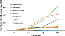 Chlorella sorokiniana (formerly Chlorella vulgaris) UTEX 2714 was obtained from the Culture Collection of Algae at the University of Texas. The microalgal cell suspension was diluted to 2.6 × 106 cells mL−1 with TAP-C medium and mixed with 5 mg mL−1 of dextran-coated superparamagnetic magnetite (Fe3O4) nanoparticles solution. The 160 µm sized droplets were generated using droplet generation device (Supplementary Fig. S1) and reinjected into the droplet incubation device (Supplementary Fig. S4b). For the photoautotrophic cultivation of microalgal cells in microdroplet, the droplet incubation device was stored at 23 °C with 5% CO2 in a CO2 incubator under continuous light of 150 µmol photons m−2 s−1. In addition, the humidity of CO2 incubator was maintained at 90% to prevent droplet shrinkage25. The images of cells in microdroplet was taken by DSLR camera. We could count the number of cells in microdroplet using the naked eye and ImageJ software.