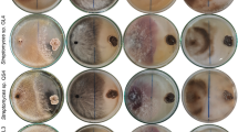 All isolates were screened for their antagonistic activity using a dual culture method as per Bredholdt et al.87. Briefly, a 5 mm potato dextrose agar (PDA) block with fungal culture was placed at the center of a petri plate containing PDA and the actinobacterial isolates were streaked at the periphery of the plates. The plates were incubated at 28 °C for 7–14 days and the diameter of fungal mycellial growth was measured and compared to the control (without any actinobacterial isolate). Plates with fungal pathogen alone served as the control and the percentage of inhibition was calculated: % inhibition = [1-(Fungal growth/Control growth)] × 100.