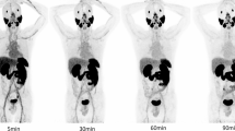 The biodistribution of 67Ga-DOTA-(D-Asp)n (nā=ā2, 5, 8, 11, or 14), 67Ga-DOTA-(L-Glu)14, 67Ga-DOTA-(D-Glu)14, [18F]NaF, and 99mTc-MDP in normal mice is shown in TablesĀ 1ā9. Among these compounds, 67Ga-DOTA-(D-Asp)8, 67Ga-DOTA-(D-Asp)11, 67Ga-DOTA-(D-Asp)14, 67Ga-DOTA-(L-Glu)14, 67Ga-DOTA-(D-Glu)14, [18F]NaF, and 99mTc-MDP showed high accumulation and retention of radioactivity in bone. 67Ga-DOTA-(D-Asp)5 showed moderate accumulation of radioactivity in bone; however, the level of radioactivity decreased 3āh after injection. 67Ga-DOTA-(D-Asp)2 caused subtle accumulation of radioactivity in bone. Although there was little radioactivity in other tissues at 3āh after the injection of 67Ga-DOTA-(D-Asp)n, 99mTc-MDP, and [18F]NaF because of rapid excretion via the kidneys, the radioactivity in the kidneys after the injection of 67Ga-DOTA-(L-Glu)14 and 67Ga-DOTA-(D-Glu)14 was retained.