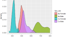We measured the following locomotor parameters in the ‘initial response’ of the wind-elicited walking, which was defined as a continuous walking trot followed by a stationary moment24,26: walking distance, reaction time, maximum walking speed, walking direction, and turn magnitude. The walking direction was defined for forward as 0º so that the direction opposite to stimulus angle was 90º and backward direction was 180º (see insets in Fig. 3a). The turn magnitude was measured as an absolute value to compare the magnitude of turning movement. In Fig. 4d and e, we used absolute walking direction defined as follows: 0º means the cricket moved in the forward direction and 180º means the cricket moved in the backward direction. For statistical analyses of the scalar parameters such as reaction time, maximum walking speed, walking distance, and turn magnitude, we calculated average values in trials categorized into ‘wind-elicited response’ for each individual to avoid pseudo-replication. For analysis of the walking direction that was a circular parameter, we calculated mean of angle and circular variance for each individual using a package in R programming for circular statistics48. Prior to the statistical test of significance of the stimulation types, we checked the distribution of all dataset for mean and S.D. values for each individual, using Kolmogorov-Smirnov test. To assess the significance of the stimulation types for response probability (Fig. 2a), maximum walking speed (Fig. 2c), reaction time (Fig. 2d), walking direction (Fig. 3b and c), and turn magnitude (Fig. 4b and c), of which the data were distributed in Gaussian, we used one-way repeated-measures analysis of variance (ANOVA). If the main effect of stimulation types was significant, we used a paired t-test followed by Holm’s correction as a post hoc test. To assess the significance of the stimulation types for walking distance (Fig. 2b) and auditory response probability (Fig. S1), of which the data were not distributed in Gaussian, we used Friedman’s test and Wilcoxon paired-sample test instead of ANOVA and t-test, because the data sets were different from Gaussian distribution. To compare the variance in distributions of the walking direction among the three types of stimulation, we used Wallraff’s test using the R programming package of circular statistics48,49. To compare the variance in distributions of the turn magnitude among the stimulation types, we used an F test. To assess the significance of sound frequency for the relationships between the walking direction and the turn magnitude, we used a multiple regression analysis for their plots in absolute values considering an interaction effect of the walking direction and the stimulation type. For analysis of the correlation between the walking direction and the variance of turn magnitude, we calculated standard deviations of the turn magnitude for ranges of every 30º (i.e. 0º–30º, 30º–60º, 60º–90º, 90º–120º, 120º–150º, and 150º–180º) of the walking direction. Further, we tested the significance of the stimulation type for that relationship, using multiple regression analysis.