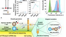 More recently, cellular array-based screening strategies have been developed using microarrays of immobilized pMHC tetramers or dimers13,14,15,16,17,18,19. By utilizing predetermined spatial coordinates rather than a panel of fluorescent tags in a flow cytometry setting, pMHC microarrays allow the simultaneous identification and characterization of a large number of T cell receptor (TCR) specificities. Deviren fabricated the protein microarrays by spotting the H-2Kb-Ig dimers loaded with SIYRYYGL peptide onto a film-coated glass surface with a high density to enumerate the carboxyfluorescein succinimidyl ester (CFSE)-labeled 2 C CD8+ T cells which mixed with splenocytes from C57BL/6 J mouse14. They demonstrate the feasibility of using pMHC microarrays to selectively capture and enumerate antigen-specific CD8+ T cells. Furthermore, artificial antigen-presenting microarrays have been established by co-immobilizing pMHC tetramers, costimulatory antibodies, and cytokine-capture antibodies in each spot to screen for ASTs and to detect their local functional responses15,16,17. Although encouraging results and prospects have been reported, there are still challenges for pMHC microarrays. First, unlike pMHC tetramer staining, the purpose of the cellular microarray is to determine (or semi-quantify) the presence of AST cells rather than providing an exact frequency as a result of the indirect readouts by fluorescence intensity scanning or resonance imaging17,20,21. Second, in the artificial antigen-presenting arrays, caution must be taken when interpreting the antigenic repertoire from the cytokine response, because only a few AST cells might produce cytokines upon capture14. In addition, the spot-to-spot reproducibility, detection limit, and specificity remain to be confirmed and improved. Previously, only a single study has addressed the spot-to-spot reproducibility, which improved by mild shear flow conditions, but without reporting either the within-run or between-run coefficient variation.