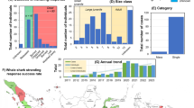 For each individual shark the species was identified according to Last and Stevens76, and sex and umbilical scar status were noted. The umbilical scar was categorised based on healing stage (e.g. open, semi-healed, healed, well-healed)12. Opened and semi-healed umbilical scars characterise the neonate period. The neonate period lasts for approximately 15 days, during which time the umbilical scar becomes closed and SHS individuals may reach a maximum of 61 cm in TL. YOY are identified by a healed or well-healed umbilical scar. The total length (TL) of each SHS was taken to the nearest centimetre13 using a measuring board designed to accommodate the particular shape of the SHS head. To mark the released sharks, PIT (Passive Integrated Transponder) tags were injected directly beneath the skin tissue at the base of the first dorsal fin77. The PIT tags were of dimensions 2 × 12 mm and emitted a frequency of 134.2 kHz (KingDoes RFID Technology, model ISO FDX-B). Recapture identification was carried out by scanning all sharks brought aboard. At first capture, two biopsy tissue samples of about 5 mm each were taken from the pelvic fins of each SHS for future genetic analyses. It was noticed from recaptured individuals that the biopsy wound was healed and regenerated within two to three weeks.