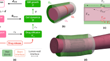 where ξ is the local resistance, estimated to be 2.88 from the empirical formula ξ = 288/Re by Fester et al.40, for a vessel constriction diameter ratio of 0.5 and Re = 100, and v is the mean velocity. The resistance R h due to the head loss is then