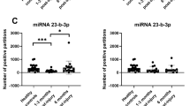 Data were expressed as the mean ± SD from at least three independent experiments. Statistical analysis was performed using Student’s t-test. The diagnostic evaluation of miR-21, miR-92 and miR-16 was performed through receiver operating characteristic (ROC) analysis. Areas under the curve (AUCs) were calculated. All statistical analyses were performed using Graph Pad Prism software (Graph Pad software). p < 0.05 was considered statistically significant.