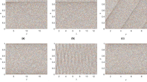 Figure 6 shows the limited penetrable horizontal visibility graphs of 3000 data points extracted from two different chaotic maps and two different chaotic systems. Here, we show our results for the degree distribuction calculated numerically for (a) ρ = 0, (b) ρ = 1 and (c) ρ = 2. In the bottom panel, we plot the relation between clustering coefficient and degrees of the nodes. In every case P(k) deviates from Eq. (2) and C(k) deviates from Eqs (6) and (7). We also find that the degree distributions of the LPHVGs associated with these chaotic maps and systems can be approximated using the exponential function \(P(k)\sim exp(-\hat{\lambda })k\), but \(\hat{\lambda }\ne \lambda =ln[\mathrm{(2}\rho +\mathrm{3)}/\mathrm{(2}\rho +\mathrm{2)}]\) in each case. We conjecture that there is a functional relation between the random and chaos dimensions13,14. Thus the parameter λ is the frontier between random series and chaotic series and can be used to distinguish randomness from chaos. The solid black and red lines in the bottom panel of Fig. 6 are the theoretical prediction of Cmin(k) and Cmax(k), respectively [see Eqs (6) and (7)]. In particular, both lines collapse in Fig. 6(d). This result shows that the limited penetrable horizontal visibility graphs for (e) ρ = 1 and (f) ρ = 2 are better discriminators from the perspective of C(k) than the horizontal visibility graph of ρ = 0 shown in Fig. 6(d).