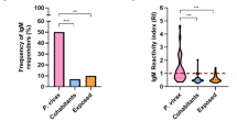 Glass slides were coated with amine solution as described in a previous report25. Evaluation of the acquired immune response was assessed in 32 pairs of vivax sera samples (D0, D28, and 1 yr). Sera pooled from eight vivax malaria patients or eight knowlesi malaria patients were used to evaluate cross-immunoreactivity. The crude rPvAARP-FL and rPkAARP-FL proteins were spotted in duplicate, incubated at 37 °C for 2 h, blocked with 5% BSA in PBS 0.1% Tween-20, and incubated at 37 °C for 1 h. The rPvAARP-FL-coated slides were reacted with sera from malaria patients or healthy individuals (1:25 dilution) at 37 °C for 1 h. Alexa Fluor 546-conjugated goat anti-human IgG (10 µg/mL; Invitrogen Life Technologies) was used as a secondary antibody, and the fluorescence signal was detected with a scanner (InnoScan scanner, Carbonne, France). The cut-off values were set to the mean fluorescence intensity (MFI) plus 2 standard deviations (SDs). The normalized MFI was calculated by dividing the MFI by the cut-off value.