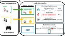 EEG signals were down-sampled to 250 Hz, high-pass filtered at 0.1 Hz (Chebyshev II filter) and notch filtered at 50 Hz and its first harmonic (100 Hz). Channels located on the forehead and cheeks which mostly contribute to movement-related noise were discarded72, retaining thus 107 channels out of 128 (see SM-H). For each period, epochs with EEG signals exceeding 100 μV were automatically discarded; retained signals were visually inspected for the removal of artifacted epochs and noisy channels (rejected channels range: 3–24). Rejected signals were substituted with signals obtained via spline-interpolation73. Retained epochs of each session and period (pre- and post-) were concatenated and submitted to an Independent Component Analysis to remove ocular and/or muscular artifacts74. After the pre-processing, periods’ time length ranged from 3 to 5 min. Signals were finally re-referenced to the mastoids’average75 (reducing thus the number of channels to 105, see SM-H), and divided in 2 s non-overlapping epochs. Details about breathing signals processing and analyses are provided in SM-C.