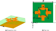 In order to provide a more comprehensive explanation of the working principle of a reflective metasurface, the effect of the ground plane will be analysed. Indeed, it is worth highlighting that the anisotropic behaviour of the reflecting surface does not depends only on the unit cell topology, but it is affected by the interaction between the periodic surface and the ground plane. In fact, treating the periodic arrangement of metallic elements as a partially reflecting surface, the working principle of a reflecting metasurface can be explained with the interference theory. In light of this, the backscatterd field can be interpreted as a sum of infinite contributions of electric field transmitted through the metasurface interface and reflected by the ground plane. In the following analysis, the co-polar reflection (transmission) coefficient for a y-polarized wave which travels from the medium 1 to the medium 2 is indicated as R yy12 (T yy12 ). Similarly, the cross-polar reflection (transmission) coefficient for a y-polarized wave which travels from the medium 1 to the medium 2 is R yy12 (T yy12 ). In this analysis, the free space is referred as medium 1 and the dielectric substrate is referred as medium 2. The propagation constant inside the dielectric substrate with electric permittivity ε is \(\beta =\sqrt{\varepsilon }{k}_{0}d\) (k0 = free space propagation constant and d is the substrate thickness). When the EM wave impinges on the interface, it is partially reflected and partially transmitted. The transmitted wave travels in the dielectric substrate and is reflected by the ground plane, which is characterized by a reflection coefficient equal to −1. When the two waves impinge on the interface, they have experienced a phase rotation equal to \({e}^{j2\beta }\). At the air/metasurface interface, the y-polarized impinging field can be immediately reflected in cross-polarization by the metasurface but some of the signal penetrates the first layer and start bouncing between the metasurfaces and the ground plane. The part of the signal which penetrates the first interface can have two polarization states (x and y polarization). This signal can emerge in cross-polarization if suitable combinations of reflections verifies. For instance, the signal can penetrate the first layer remaining y-polarized, but it can be converted as it impinges the metasurface from the bottom. Equivalently, the transmitted signal can penetrate the first interface being converted in x-polarization and emerge after one bounce in the ground plane. It can be demonstrated that an infinite set of these contributions exist and can sum up coherently or not. Each of these terms can be written in the form of geometric series. Beside the rigorous analytical analysis, it is worth underlining that the total reflection of the composite surface can be written as a summation of terms of different orders. The number of terms needed to correctly estimate the backscattered field depends on the reflectivity of the surface. In the case of metasurface reported in Fig. 1, the cross-polar scattered field has been estimated considering all terms from zero-th order (R yy12 ) up to fourth order \(({\tilde{R}}_{yy}^{4})\). In this way, the co-polar and cross-polar component of the scattered field can be expressed as follows: