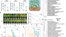 To further assess the effect of drought stress on the growth of NtLTP4 transgenic lines during vegetative growth stage, 8-week-old WT and OE plants were grown with or without water for another 15 d. The WT plants showed worse leaf wilting and chlorosis than OE plants under drought treatment (Fig. 6e). Upon re-watering, the survival rate of transgenic plants reached approximately 55–80%, whereas WT plants showed a survival rate of 50% (Fig. 6e). Additionally, we evaluated the effects of drought stress on photosynthetic gas exchange parameters. As shown in Fig. 6f, no significant differences were observed in net photosynthesis rates (Pn) between transgenic and WT plants under standard conditions. Drought stress resulted in marked decrease in Pn in transgenic and WT plants, whereas this value was maintained at a higher level in OE lines than in WT under drought stress (Fig. 6f). The transpiration rates (Tr) of the transgenic and WT plants decreased after drought treatment, whereas the OE lines indicated lower transpiration rates than in WT plants (Fig. 6f). Similar results were observed for stomatal conductance (Fig. 6f). These results indicated that the NtLTP4-overexpressing lines were more tolerant to drought stress than WT plants secondary to regulation of transpiration rates and stomatal conductance.