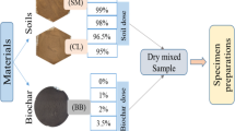 An OCA Contact Angle System precision tensiometer (DataPhysics, Germany) was used to determine the contact angle of the droplets on the surfaces of the biochar, charcoal fines, and soil samples, and the contact angle was also obtained by image analysis. The methodology used was based on that described by Bachmann et al.38. The angles on the right and left sides of the droplet images for the different solutions were calculated and automatically averaged, providing the equilibrium contact angle after reaching a constant value for at least two minutes. The hydrophobicities of the materials were evaluated using different polarity solvents: water and diiodomethane. The volumes of the droplets applied to the surfaces of the materials were 10 μL (water) and 6 μL (diiodomethane), delivered using a 50 μL graduated syringe. For these evaluations, glass slides were thoroughly washed and dried, so that no particles remained that could compromise the evaluations. Each slide was wrapped with double-sided adhesive tape, which was then covered with a layer of soil or biochar particles. In preliminary experiments, it was found that the tape provided contact angles of approximately 90° against water, and did not affect the contact angles obtained with the sample particles attached to the surface. The system used for the evaluations consisted of a digital camera fixed in front of a platform, where the slides were positioned in order to be able to view the contact angle of the droplets delivered from the 50 μL syringe suspended above and very close to the slide. A single filament lamp was positioned in front of the slide holder in order to ensure a sharp image. Image acquisition was controlled by SCA 20 software (DataPhysics, Germany). For each treatment, five droplets were used, resulting in 10 angle measurements. Young’s equation was used to relate the contact angle (θ) to the surface tension of the liquid (\({\gamma }_{l}\)), the interfacial tension (\({\gamma }_{sl}\)) between the liquid and the solid, and the surface free energy (\({\gamma }_{s}\)) of the solid (Equation 3).