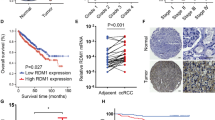 Based on these findings, we further examined whether higher expression of RDM1 levels were positively associated with various clinical outcomes in human lung adenocarcinoma. Indeed, higher expression of RDM1 mRNA levels was found in the advanced N stage tumors (1.5 fold or higher in tumors, p < 0.05, Fig. 1E)14. Furthermore, at 1 year or 5 years of diagnosis, RDM1 levels were significantly higher in those who had deceased compared with those who were still alive (1.5 fold or higher, p < 0.01, Fig. 1F). Similar results were also true for patients with recurrence at 3 or 5 years (1.6 fold, p < 10−5, Fig. 1G). Therefore, in general, high RDM1 levels were correlated with poor clinical outcomes in human lung adenocarcinoma. The findings, that RDM1 was over-expressed in lung adenocarcinoma and that high RDM1 was strongly associated with poor clinical outcomes, suggesting the oncogenic role of RDM1 in human lung adenocarcinomas. Finally, we further investigated the expression patterns of RDM1 in smokers since smoking is the leading risk factor of lung cancer. Noticeably, we observed that RDM1 was also highly expressed in lung tumors of smokers compared with nonsmokers, suggesting a positive link between smoking and the RDM1 level (2 folds, p < 0.001, Fig. 1H)16.