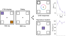 As shown in Fig. 3, the experimental procedure was similar to that used in Experiment 1, with two exceptions. First, all stimuli were squares, and the colors of all memorized and search items in each trial were randomly selected from 180 colors of the color wheel with the restriction of separating each other at least 72°, as in previous studies23,37. Second, after the retrieval cue and the 500-ms ISI, the participants were presented with either only the visual search task, or only the two successive memory tests. The visual search task and the memory tests occurred with the same frequency and were administered in an unpredictable fashion. As concerns the memory tests, the participants clicked on a standard color wheel38 to report the identity of the color of the memorized items.