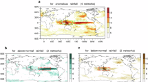 The Climatic Research Unit (CRU) Time-series (TS) version 4.00 rainfall data is employed in this study, which has a horizontal resolution of 0.5° latitude by 0.5° longitude and spans the time period from 1901 to 201547. The CRU data are provided by the Centre for Environmental Data Analysis from their web site http://catalogue.ceda.ac.uk. The monthly mean atmospheric data used in this study are from the National Centers for Environmental Prediction (NCEP) /National Center for Atmospheric Research (NCAR) and available at the website of NOAA/OAR/ESRL PSD https://www.esrl.noaa.gov/psd. This NCEP/NCAR dataset has a 2.5° × 2.5° horizontal resolution and 17 vertical levels extending from 1000 to 10 hPa and covers the period from 1948 to the present48. The monthly mean Sea Surface Temperature (SST) data on 1° × 1° grids are provided by the Met Office Hadley Center (https://www.metoffice.gov.uk), covering the period from the year of 1870 to present49. The National Oceanic and Atmospheric Administration (NOAA) reconstructed precipitation (PREC) data, provided also by the NOAA/OAR/ESRL PSD, are used to analyze the rainfall anomalies over oceans, which is constructed on a 2.5° × 2.5° latitude/longitude grid across the global spanning from 1948 to the present50. The time period of 1948–2015 that all the datasets cover is considered in this study. To exclude the impacts of interdecadal change, the variability longer than 7 years has been removed from the original datasets through a Lanczos filter51.