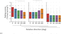 A Bayesian Information Criterion (MATLAB® 2013; aicbic function) was then calculated comparing our model with two free parameters (constant gain, relative weights; Equation 3, Fig. 3 black line, Fig. 4) with the simple parameter-free eye in head model (Equation 2, Fig. 3 blue line) which yielded a ΔBIC score of 132.154 in favour of Equation 3 over Equation 2, which is considered to be a “very strong” difference16. This suggests that participants’ estimates of shape from shading are better predicted with a retinal orientation model plus the inclusion of an additional component, which we attribute to cross multiplied otolith signals as depicted in Fig. 4.