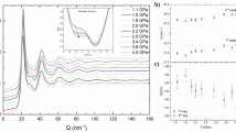 At higher pressures, only liquid diffraction is observed (Fig. 3a). Three maxima in the liquid diffraction profiles are observed, all of which shift to higher-Q with pressure (compare Fig. 3a(i) with Fig. 3a(v)). The atomic structure factor S(Q) = 1 + 4\(\pi {\rho }_{0}\,{\int }_{0}^{\infty }\,{r}^{2}[g(r)-1]\frac{\sin ({Q}_{r})}{{Q}_{r}}dr\), where ρ0 is the average atomic density, is obtained by scaling the diffracted intensity by the atomic scattering factor20 and normalising it to 1 at the largest experimental Q value (Q = \(\tfrac{4\pi \,\sin (\theta )}{\lambda }\)) (Fig. 3b(i–v)).