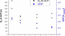 OCP, EIS and PC were all conducted through a CHI604B electrochemical analyzer. The EIS measurements were performed over the frequency range from 105 to 10−2 Hz at the corrosion potential with the ac perturbation amplitude of ±10 mV. ZSimpWin software was used to analyze the impedance spectra to get the parameters of each element of equivalent circuit. The PC measurements were carried out by applying over-potentials from −250mV to 250 mV with respect to the corrosion potential at a scan rate of 0.167 mV/s.