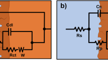 Figure 7(c) shows EIS plots of A283-D steel at different temperatures in highly compacted bentonite with saturated water (30%). The gradient temperature decrease was adopted to simulate the cooling process after the climax of water saturation in bentonite. The radius of condensance arc at low frequency increases with the temperature decrease. The oxygen content is fairly low in highly compacted bentonite saturated with water, therefore, it is not the main factor affecting the corrosion processes at different temperatures. Due to the gradual corrosion products formation process, the initially generated corrosion products are of only small amount and the corrosion products layer is fairly thin, no obvious protective effect on the metal substrate exists. While higher temperature accelerates the corrosion reactions, thus the initial smaller radius of capacitive arc at higher temperature was observed. As the temperature decreases, the combined reduction effects of temperature on electrochemistry reaction rate and the thickening of the accumulated corrosion products layer show increasing in radius of capacitive arc. But below 55 °C, it seems that the radius of the capacitive arc starts to decrease gradually. The concentration of Cl− and SO42− at the interface between container and the bentonite is consistently at a higher level because of their high concentration in underground water, and they can also be regenerated and accumulated on the surface of container39. Of these two species, Cl− can weaken the passive film formed on the surface of metal and penetrate through the corrosion product layer, forming soluble corrosion product. Although further decrease of temperature below 55 °C reduces the electrochemical reaction rate, if the weakening effect of Cl− on the corrosion products layer is stronger than that of temperature on the reduction of electrochemical reaction, the corrosion process as a whole will be enhanced, resulting in a smaller capacitive arc radius. It can also be found that the change of capacitive arc radius with temperature at higher temperature above 55 °C is larger than that below, indicating that the corrosion rate of container tends to be steady in the later period of deep geological disposal. The equivalent circuit shown in Fig. 8(a) was used to fit the EIS data of A283-D specimen, where Rs is the corrosion medium resistance, Qb is the condensance of corrosion product layer, Rb is the resistance of corrosion product layer, Qdl is the electrical double-layer capacitor between the surface of specimen and solution, Rct is the charge transfer resistance. The parameters fitted by ZSimpWin software are shown in Table 1. It can be seen from Table 1 that the film resistance increases gradually with the continuous accumulation of corrosion products formed on the surface of container. The change of charge transfer resistance with temperature roughly conforms with that of capacitive arc radius.