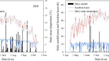 We used scaffolding and shading nets to build temporary shading sheds. Shading nets of different shade strength were designed and fabricated. The amount of solar radiation reaching a distance of 1.5 m underneath each shading net was measured with a Sunscan (SUNSCAN, Delta-T, UK) and the nets that achieved shading of 15%, 30%, and 50% of natural light were chosen for the experiments. The shading sheds were fixed in place about 1.5 m above the maize canopy in order to maintain the same microclimate conditions (except for solar radiation) observed in the unshaded portions of the field. The shading treatment period began at the silking stage and lasted until maturity because this is the key growth period that determines maize yield and this period is rainy season and decreases in solar radiation often occur during this period47,48. The silking stage was defined as the date when 60% of the ears showed silk emergence. Physiological maturity was defined as the date when the black layer appeared.