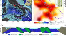 Remarkably, the contrast in shear velocity structure between the northern Tyrrhenian and the southern Tyrrhenian in our model coincides approximately with the location of the 41° Parallel Line (Fig. 3a, see also the tomography maps at short periods, Fig. 2). The 41° Parallel Line is defined as a regional magnetic and free-air gravity anomaly that is conventionally regarded as separating the northern Tyrrhenian continental structure from the heterogeneous structure in the southern Tyrrhenian39,40,41,42. The structural significance of 41° Parallel Line in the geodynamic evolution of the basin is still debated3,40,41,43, nevertheless, our results provide the first comprehensive seismological evidence for the presence of this lithospheric feature.