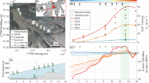 The NGS terminus slowed after the initial collapse, advancing only 5 km from summer 2009 to 2010 (7–10 m d−1) and another 5 km by 2016 (2–3 m d−1) (Supplementary Information). By this time, the glacier had nearly doubled its pre-collapse length. The rate of NGS mass loss in the years during (−2.33 ± 0.28 m w.eq. a−1 in 2008–2010) and after (−1.50 ± 0.35 m w.eq. a−1 in 2010–2014) the collapse is 500–900% greater than the long term 1936–2008 average of −0.25 ± 0.07 m w.eq. a−1 (Supplementary Information). We estimate the mass balance impact by the change in hypsometry caused from the instability using a surface mass balance model (Supplementary Information). In the current climate (2000–2016 average), the geometric change induced by the surge itself reduces the accumulation area by 35% which nearly doubles the negative surface mass balance (+84%). As the glacier was already unbalanced with climate before its collapse together with the 100–150 m rise in ELA over the past 2 decades, these changes are likely irreversible relative to the 2008 ice volume (Supplementary Information).