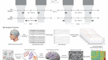 The number of cycles per wavelet (m) were logarithmically spaced between 3 and 10 and subsequently rounded off. Wavelets were normalised by factor \(A=\,{\sigma }_{t}{\sqrt{\pi }}^{-\frac{1}{2}}\) with \({\sigma }_{t}=m/2\pi {f}_{0}\). Single trial data was convolved with the Morlet wavelets by multiplication in the frequency domain using fast fourier transformation with boxcar windows. Wavelet filtered single trial data was then reconstructed in source space using exact low-resolution brain electromagnetic tomography (eLORETA; regularisation: 0.05)54. Lead fields were computed for a three-shell head model55. The customised cortical grid was derived from a cortical surface provided by Freesurfer56 in MNI space by reducing the number of cortical nodes from 270000 to 10000. Dipole directions at each node of the cortical grid were estimated by means of singular value decomposition of the trial averaged spectral power individually for all bands and kept constant for all trials of the given participant. Power within each frequency bin was computed by multiplication with the complex conjugate (conj.m). Since we subtracted event-related potentials, we refer to the estimates as induced power. Average power in a time window before stimulus onset ([−400; −100] ms relative to stimulus onset) was used for baseline normalization. That is, the baseline was subtracted from all power estimates within each frequency bin and subsequently the difference was divided by the baseline and multiplied by 100. Thus, we computed percentage of change relative to baseline. By visual inspection of the resulting time-frequency landscapes, frequency bands in the theta, alpha, and beta range were chosen individually for each participant while gamma band was chosen uniformly based on canonical band width (mean values and range in parentheses; theta: 4.7 [3.6; 5.8] Hz, alpha: 11.5 [9.2; 13.5] Hz, beta: 23.0 [17.2; 29.7] Hz, gamma: 78.9 [63.9; 87.6] Hz). For that purpose, we computed individual time-frequency landscapes equivalent to the illustration of the grand average in Fig. 4a for occipital, parietal, temporal and frontal regions separately. Spectral peaks or troughs of marked changes of spectral activity from baseline were detected and narrow frequency bands around these peaks were constructed. When clear peaks were missing, we resorted to canonical definitions of band-widths and oriented the boundaries of bands according to neighbouring bands. Thereby, we ensured that functionally relevant frequency bands were chosen.