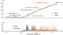 There were some specific adjustments in the oculomotor and interception behavior that point to a general strategy of trying to maximize the time without a corrective saccade before the tap. The shorter saccadic latencies could to some extent be explained by a general speeding of oculomotor latencies, including an earlier start of the pursuit response. However, when we analyzed the eye crossing times, which are considered to be related to the decision to make catch-up saccades during pursuit24, we found a difference between forward and backward saccades. There was no change in eye crossing time for backward saccades, suggesting that the latency change of backward saccades was probably related to the general decrease of oculomotor latencies. In contrast, for trials with forward saccades, which typically happen later in the trial, there were some strategic adjustments. First, forward saccades occurred with significantly smaller eye crossing times in the interception task (Fig. 5b). This indicates that they were triggered when there was a smaller potential error signal, so that they occur earlier during the trial. Second, participants took more time until they tapped in trials with forward saccades (Fig. 5c). Thus, in line with the results of previous studies45, participants seem to adjust their oculomotor behavior to the task they need to deal with. Minimizing the occurrence of corrective saccades before interception is a useful strategy to maximize spatial resolution at the time close before the tap4 to gain reliable information at this crucial moment28. It also avoids the effects of saccadic suppression or mislocalization30,31, which starts already roughly 100 ms before the execution of the saccade31,46.