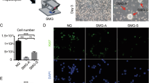 With the increase of experimental time, the metabolic effects due to SMG condition became more evident: we observed differences between samples from SMG cells and their control cells in NG condition at day 8 on PC2 (p = 0.01) (not showed) and at day 13 on PC1 (p < 0.00001) (Fig. 7b). Moreover, at day 13, we observed metabolic differences between medium samples from cells cultured in KM or HDM only in NG condition. Then, to identify the metabolites that best contribute to the discrimination between samples from SMG cells and their control cells in NG condition at day 13 on PC1, we analyzed the loadings values from PCA with a threshold of 0.95 (Fig. 7e). PC1 included the following variables with the highest correlation levels: beta-hydroxybutyrate, lactate, alanine, acetate, glutamate, pyruvate and glucose. Therefore, considering the net balance of these metabolites (i.e. the difference between all the bins of the spectra acquired at day 13 and the corresponding averaged bins of the spectra at 0 hours), PC1 indicated that the SMG induced a lower consumption of glutamate and pyruvate as well as a higher consumption of glucose. Moreover, the cells in SMG condition increased the production of beta-hydroxybutyrate, lactate, alanine and acetate. Thus, the SMG increased the glycolytic phenotype of hBTSCs.