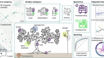 Taxonomic α-diversity was described as the number of observed ASVs, and diversity and richness were estimated with Shannon and Chao1 indexes, respectively. An approximately maximum-likelihood phylogenetic tree was inferred using FastTree 2.145, and phylogenetic diversity was calculated as Faith’s phylogenetic diversity46. Taxonomic β-diversity at the ASV level was described by performing principal coordinate analysis (PCoA) using Bray-Curtis and Jaccard distance matrices. Likewise, phylogenetic β-diversity was estimated by PCoA using weighted and unweighted unifrac matrix distances47 in the ‘phyloseq’ R package48. Mixed models were implemented with the ‘nlme’ R package49 to analyze the effect of time on α- and β-diversity (PCoA scores) of bacterial communities from the grape marc, with time as the fixed factor. Repeated measures were accounted for by considering the effect of time nested in each sample as a random factor. The normality of residuals and homogeneity of variance across groups was checked for each variable. Post-hoc comparisons were performed with Tukey’s test, and multiple test corrections were performed with Benjamini–Hochberg FDR implemented in the ‘multcomp’ R package50. The same model was used to analyze the effect of time on the relative abundances of bacterial phyla and classes.