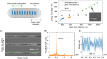 Figure 2c,d show top and lateral field effect scanning electron microscope (FESEM) images, respectively, of one of the fabricated gratings (with d = 120 nm and s ∼ 260 nm). Remarkably, grating quality and morphology are similar to those of gratings fabricated in previous studies with a much more sophisticated development process than the one used in the present work13. The grainy texture of the surface is produced by gelatin fibres randomly distributed but oriented rather parallel to the substrate surface39. Such texture is observed independently on the type of development process. After developing, the grating profile is not sinusoidal, indicating that the development process is a nonlinear function of exposure. With this procedure the duty cycle for all the gratings fabricated is approximately 75:25 (hill:valley) so that a high feedback coupling coefficient, i.e. a low threshold, can be achieved40,41.