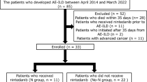 Nintedanib is often used for the treatment for idiopathic pulmonary fibrosis (IPF)1. The INPULSIS trial suggested that treatment with nintedanib at 300 mg/day decreased the annual rate of decline in forced vital capacity (FVC) and acute exacerbations in patients with IPF2,3,4. Nausea, diarrhea, and liver dysfunction are the most common adverse effects of nintedanib, and serious adverse events have been reported in approximately 30% of patients receiving nintedanib treatment. Liver toxicity, including elevated transaminase levels, is also reported to be a significant adverse event. Ikeda et al. reported that patients with a body mass index (BMI) ≤22 kg/m2 showed a high incidence of liver dysfunction and that a small body surface area was a predictor of liver function disorder during nintedanib treatment5,6. In most cases, liver function recovered within 4 weeks. Moreover, most patients who developed mild liver dysfunction had no symptoms. Therefore, increased liver enzyme levels in patients receiving nintedanib treatment may not be clinically significant.