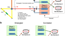 We describe here the experimental setup used to generate photon pairs, as well as the emulation system for the slot machines. The output of an excitation laser passed through a polarizer, a half-wave plate (denoted HWE), a quarter-wave plate (QWE), and a dichroic mirror (D), and was incident upon a polarization beam splitter (PBSL) shown in Fig. 1. The horizontally and vertically polarized components of the incoming light travelled clockwise and anti-clockwise, respectively, through a Sagnac loop containing a half-wave plate (HWL) and type II quasi-phase-matched periodically poled KTiOPO4 (PPKTP) nonlinear crystal (Cr), where spontaneous parametric down conversion (SPDC) was induced39. The entanglement of orthogonally polarized photons was generated in the PBSL, where the two paths were recombined. The signal and idler photons corresponded to the outgoing components from the PBSL; the signal photons were directed into the branch for the decision making of Player 1, whereas the idler photons travelled to the branch for the decision making of Player 2. Note that the signal and idler photons had distinct wavelengths and were spectrally selected to avoid contamination, which would have affected the final choices of the players.