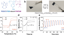 The setup is composed of a home-built heating stage that consists of a 10 cm by 10 cm aluminum plate with a heating foil (Thermo Polyester Heating foil, Cat. No. 532878 – 62, Conrad, Germany) attached below. The temperature of the foil is controlled by an ATMega328 microcontroller, mounted on an Arduino board (Cat. No. 191789 – 62) while the feedback temperature is read from a measuring sensor (Linear IC, Temperature sensor, Cat. No. 1123323 – 62, Conrad, Germany) which is immersed in the measurement container (2.4 cm × 2.4 cm × 1.6 cm, plastic). The gel (sample height: 3 mm) is placed in this container and fully covered with water. The temperature is set to reach 45 °C and then cool down to 30 °C. The heating stage with the gels is filmed with a camera (UI-3240ML-C-HQ; IDS, Germany) at 0.9 frame s−1 until the heating protocol is completed. The long-term heating measurement uses a heating program where the temperature varies between 28 °C and 42 °C for twenty cycles while dwelling at each temperature for 5 minutes. Assuming a linear approximation of the heating profile the heating rate was ~0.04 °C sec−1. Imaging was conducted as described above.