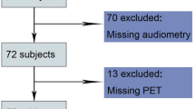 Pure-tone audiometry was used to assess peripheral ear function. The assessment was conducted by audiologists and followed the standards of the British Society of Audiology and of the American National Standards Institute. Participants’ ears were checked by otoscope. Pure-tone air conduction decibel thresholds were obtained in each ear at frequencies 0.5, 1, 2, 3, 4, 6, and 8 kilohertz with calibrated audiometers (Grayson Sadler GSI 61 or Interacoustics Callisto) and TDH 39 supra-aural earphones (Telephonics, Huntington, New York). The World Health Organization (WHO) criteria for hearing loss were used: pure-tone average (PTA) ≥ 26 dB for 0.5, 1, 2 & 4 kHz in the better ear13. Participants meeting these criteria were allocated to HLG and those below this threshold were allocated to CG. We also calculated the PTA of these frequencies for the worse ear. The PTA for low (0.25, 0.5 & 1 kHz) and high frequencies (3, 4, & 6 kHz) for both ears were included to provide an estimate of low and high frequency loss.