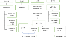 Serological monitoring was assessed for the detection of anti-T. gondii IgM/IgG antibodies with the following assays: the Vidas Toxo system (BioMérieux), the Platelia Toxo IgG/IgM (Bio-Rad), and the Immulite (Siemens). The Vidas Toxo IgG Avidity assay (bioMérieux) was used for the estimated time of infection (Fig. 2).
