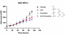 Surgical vestibular schwannoma (VS) and great auricular nerve (GAN) specimens were obtained from patients undergoing indicated procedures at Massachusetts General Hospital and Massachusetts Eye and Ear. The study was conducted in accordance with the Helsinki Declaration of 1975 and written informed consent was obtained from all subjects prior to inclusion. GAN (control) samples were obtained from patients undergoing benign parotidectomy unrelated to VS, during which this nerve is routinely sacrificed. Patients who had received radiation therapy prior to surgery were excluded. All VS and GAN samples were received and processed according to protocols approved by the Human Studies Committee of Massachusetts General Hospital and Massachusetts Eye and Ear (Board Reference #14–148 H). Following surgical resection, VS or GAN tissue was immediately placed in saline solution, transported to the laboratory, and cultured. Our methods describing precise protocols for surgical specimen collection, processing, and primary cell culture are published in detail24,25. Mouse Nf2−/− Schwann cells used in our mouse allograft model were maintained in 10% Schwann cell medium containing Schwann cell growth supplement (SCGS, ScienCell).