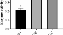 The predicted values of F1 and F2 for production media to be validated along with the predicted responses R1 and R2 are listed in Table 4 along with other incubation parameters. Figure 4 represents the growth as well as xylanase and pectinase activities obtained from optimized production media (OPM) along with their normalized ratios calculated as mentioned in Materials and Methods section A comparison of OD600 and growth ratios of OPM (Fig. 4d) with those on WB and CP containing media (Fig. 2) revealed that the OPM enhanced. the growth of bacterial isolates several folds than individual WB or CP containing medium. Further comparison of xylanase and pectinase ratios with growth ratios confirmed that though the OPM acted as a growth medium, the xylanase ratio was 3 to 4 times more than the growth ratio and the pectinase ratio was 25–30 times more than the growth ratio. The observed experimental values for xylanase and pectinase production responses during validation studies were 15.10 U (M35-xylanase), 14.27 U (J208-xylanase), 411.58 U (M35-pectinase) and 728.74 U (J208-pectinase). As shown in Table 4, all these four responses were found to be in the range of predicted interval (at 95% PI) as given by the software. These results verified the validity of the model and the existence of the optimal points indicating the adequacy of the RSM data. Co-production of xylanase (4.31 U/mL) and alkaline protease (3.66 U/mL) by Bacillus spp have been optimized under submerged fermentation from WB33.
