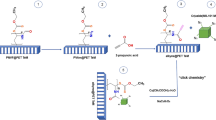 The functionalised track-etched PB2MP-g-PVDF membranes were fabricated as described in4 and displayed in Fig. 1. PVDF films, -\({[{CH}_{2} \mbox{-} {CF}_{2}]}_{n}\)-, were first irradiated with 136Xe48+ SHI of 7.46 MeV ⋅ amu−1 under He atmosphere. During irradiation, projectile-ions produce cylindrical damaged regions across the entire thickness of a PVDF film. These damages are radially distributed along the ion pathways forming so-called latent tracks. High energy radiation causes lateral bond and backbone chain scissions resulting in gas emission (H2, HF, F2), formation of alkyl radicals (–CF2–C.H2,–CH2–C.F2–CF2–C.H–CF2,–CH2–C.F–CH2), crosslinking, and unsaturated bonds (e. g. , − CF2 − , CH = CF2, − CH = CF − ). Despite the radiation process occurs under He atmosphere, some alkyl radicals located at the surface of the polymer film can be converted into peroxy radicals (ROO.) in contact with oxygen in further fabrication steps. To reveal the latent tracks into nanopores, the irradiated PVDF films were etched in 10 M KOH and 0.25 M KMnO4 solutions. As the relative radical fraction decreases as etching time increases, the etching reaction duration was limited to 30 min leading to nanopore size of around 30 nm of radius in order to preserve a significant density of radicals. Under these conditions, the remaining radicals were found sufficiently reactive to initiate a graft polymerization in presence of B2MP monomer. To efficiently graft B2MP monomer inside nanopores of the membrane, the grafting reaction temperature was kept at 65° C to activate trapped alkyl and peroxy radicals.