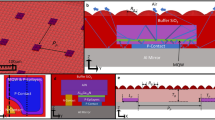 Figure 6(a,b,c,d) show plan-view SEM image, monochromatic CL images at 375 nm, 387 nm, and 435 nm, respectively, from single micro-LED on a sapphire nano-membrane. The monochromatic CL measurements clarified the emission from all facets as shown in Fig. 6(b,c,d). Emissions with shorter wavelengths were measured from the facets in order of \(\{11\bar{2}2\}\), \(\{1\bar{1}01\}\), and \((0001)\), in good agreement with the results in the literature42,43,44,45. The emissions with various wavelengths were attributed to the differences in growth rates and indium incorporation on each facet45,46. In addition, the thinner InGaN quantum well in semi-polar facets reduced the QCSE and leads to an increased emission energy, which is consistent with the CL results. Points on each facet of the micro-LED in Fig. 6(a) indicate positions where spatially-resolved CL measurement were conducted, and the corresponding CL spectra were shown in Fig. 6(e). Peak wavelengths of the spatially-resolved CL spectra from each facet were corresponded to the monochromatic CL images shown in Fig. 6(b,c,d), respectively. Two orders of magnitude stronger emission was observed from \((0001)\) plane at 435 nm than that from semi-polar \(\{11\bar{2}2\}\) and \(\{1\bar{1}01\}\) planes. This result is different from emission properties of similar micro-sized light emitters with \(\{11\bar{2}2\}\), \(\{1\bar{1}01\}\), and \((0001)\) facets obtained from the selective growth by using a dielectic-patterned GaN/sapphire substrate45. Hwang et al. reported superior optical properties from \(\{11\bar{2}2\}\) facets compared to those from \((0001)\) facet, which was explained by less QCSE at the semi-polar \(\{11\bar{2}2\}\) facets. In our structures, however, the weaker CL signals from the semi-polar facets were attributed to the extremely thin InGaN wells as observed in the STEM measurements, since carriers in the very thin MQWs can be easily escape. Moreover, the ultra-thin sapphire nano-membrane significantly reduced the compressive stress in GaN, leading to reduction of QCSE in \((0001)\) facet and resultant increase in overlap of electron and hole wave functions. The strong CL emission mostly from the c-plane of the micro-LED on sapphire nano-membrane may be an important characteristic for the realization of micro-LED displays. The results suggest that the proper n- and p-metal design in micro-LEDs on sapphire nano-membranes would suppress the emission from semi-polar with shorter wavelength and generate the emission only from (0001) plane.