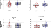 A total of 80 breast cancer samples and 80 ANCTs were assessed. We could not detect expression of TTN-AS1 in any of malignant or non-malignant tissues, so this gene was excluded from further steps. Expression levels of MAPK14 and NORAD were not significantly different between breast cancer tissues and ANCTs. Expressions of HCG11 and ZNRD1ASP were lower in tumoral tissues compared with ANCTs (P values < 0.0001). Figure 2 and Table 5 show the results of expression analysis.