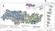 All grab samples across chronosequence from July 2013, June 2016, and July 2018 and background nutrient pulse samples from June 2016 and July 2018 were analyzed for DOM optical properties. UV absorbance was measured with a Shimadzu photo diode array detector with HPLC at 1 nm intervals between 200 to 700 nm. Specific UV absorbance at 254 nm (SUVA254) was determined by dividing the UV absorbance at 254 nm by DOC concentration, where SUVA is an index of DOM aromaticity43. Fluorescence index (FI) was determined as the ratio of 470 and 520 nm fluorescence intensities at 370 nm excitation and FI used to identify sources of DOM (terrestrial vs microbial)44. Humification index (HIX) was determined as the ratio between area under the emission spectra 435–480 nm and the sum of the peak area 330–345 nm and 435–490 nm and describes the degree of humification of DOM45. Spectral slope (S) was determined using a non-linear fit of an exponential function to the log transformed absorption spectrum in the ranges of 275–295 nm and 350–400 nm46. Slope ratio (SR) was determined as the ratio of the slope (275–295 nm) and slope (350–400 nm) which have been negatively correlated to DOM molecular weight and aromaticity46.