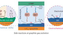 The implementation of a cathode with a high capacity and voltage to increase the battery’s energy density is in vogue; consequently, manganese (Mn) or cobalt-based (Co) cathode materials have become prevalent in the production of high energy batteries. However, since the cost of Mn is lower than that of Co, reducing Co in cathode materials is a common approach to reduce cell costs5. However, increasing the Mn content in active materials can cause other problems. The unwanted dissolution of Mn2+ in the electrolyte (also initiated by water and HF) during cell operations can cause myriad side effects such as deposits on the anode surface and a reaction with the electrolyte where the liquid electrolyte may degrade rapidly during the first few cycles to produce gas. Gas evolution during cycling is one of the major problems associated with (especially) Mn-based cathodes. These gases principally constitute CO2, which originates from the decomposition of the liquid electrolyte in the presence of Mn ions6,7,8. In the case of LMO, reaction occurs on the surface with Li+ and Mn2+, and they are leached from the surface, therefore there is more Li ions migrate from the core, consequently electrons hopping from Mn3+ to Mn4+. The disproportionate reaction of Mn3+ generates Mn2+/Mn4+ which diffuses in electrolytes; studies with LMFP are limited. The degradation of the solvents in the presence of a Li4Ti5O12 (LTO) anode and initiated by PF5- has also been reported as a source of CO2 and other gases9,10. Moreover, a paper published in 2019 reported that CO2 was found during the thermal runaway of all types of Li-ion batteries8. This problem remains a more substantial one for Mn-based materials (LiMn2O4 (LMO), LiMnxFe1-xPO4 (LMFP), LiNiMnCoO2 (NMC), etc.). This is a serious concern for the operation of pouch cell format batteries because battery cell expansion can be a safety issue11.