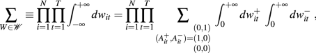 In order to calculate the partition function \(Z = \sum _{W} e^{- H(W)}\), we first need to properly specify the sum over the phase space. Given the matrix representation we have chosen for the system, and the fact that \(w_{it}^\pm = w_{it} A^\pm _{it}\), this reads: