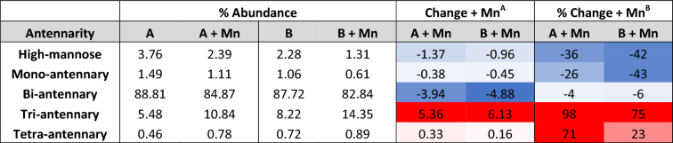 Table 2 Plasma protein N-glycan branching following Mn supplementation in severe SLC39A8 mutation carriers. Heat maps scale: dark blue → white → bright red representing − 5.0 → 0 → + 5.0 for absolute abundance changeA and − 50.0% → 0 → + 50.0% for relative changeB.