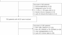 We collected the following clinical and demographic information in a prespecified datasheet: age; sex; etiologies of cirrhosis; precipitating factors; complications and laboratory parameters; organ failure events; ACLF grade and prognosis. Acute precipitating factors were categorized into HBV reactivation, hepatotoxic drugs, hepatitis A virus (HAV) or hepatitis E virus (HEV) superimposed infection, alcohol drinking, surgery, and unknown cause. Liver cirrhosis was diagnosed based on symptoms and signs of portal hypertension and findings on ultrasonography, computed tomography or magnetic resonance imaging. Ascites was confirmed via paracentesis, abdominal imaging and other clinical evidence. HE assessment and grading employed the West Haven criteria14. Gastrointestinal hemorrhage was diagnosed by a positive fecal occult blood test or the presence of blood in vomit. Spontaneous bacterial peritonitis was explored via ascites examination or laboratory culture. Infection was diagnosed as follows: (1) spontaneous bacterial peritonitis, polymorphonuclear cell count in ascitic fluid > 250/mL; (2) pneumonia, new pulmonary infiltrate in radiologic imaging plus the presence of any respiratory symptoms (cough, sputum, dyspnea, or pleuritic pain), any findings on auscultation (rales or crepitation), core body temperature > 38 °C or < 36 °C, and WBC count > 10,000/mm3 or < 4000/mm3; (3) urinary tract infection, WBC count in urine > 10/high power field with positive urine culture and urinary irritation symptoms; and (4) other bacterial infections, including catheter-related infection, osteoarticular infection, skin infection, and bacteremia of unknown cause15. As previous studies highlighted that there was no significant difference between venous and arterial ammonia values with respect to HE16, we collected venous ammonia for data analysis. ACLF grade was further identified based on the European Association for the Study of the Liver-Chronic Liver Failure (EASL-CLIF) criteria as follows: Grade 0: without organ function failure; nonkidney single organ function failure manifesting as a serum creatinine level of < 1.5 mg/dL without HE; noncerebral single organ function failure manifesting as a serum creatinine level < 1.5 mg/dL; Grade 1: single kidney function failure; single organ function failure either of liver, blood coagulation, circulatory or respiratory function manifesting as a serum creatinine level ≥ 1.5 mg/dL but < 2 mg/dL and/or grade 1 or grade 2 HE; single cerebral function failure manifesting as a serum creatinine level ≥ 1.5 mg/dL but < 2 mg/dL; Grade 2: double organ function failures; Grade 3: triple organ function failures13.