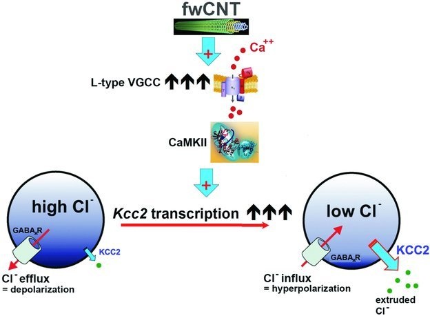 We have previously discovered that few-walled carbon nanotubes, electrically highly conductive, function as Kcc2 gene expression enhancing substrates when culturing primary cortical neurons from rodents. Our ultrastructural studies revealed that cultured neurons form tightest contacts with the fwCNT, and that the potent enhancement of Kcc2 gene expression relies on neuronal voltage‐gated calcium channels (VGCC) and, furthermore, on calcium/calmodulin‐dependent kinase II, which is linked to VGCC‐mediated calcium‐influx.
