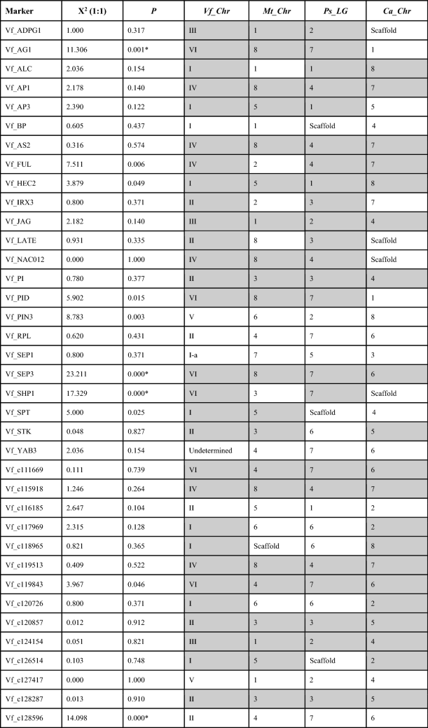 Table 3 Genetic segregation, chi-square test and location of the dehiscence related gene markers in faba bean (Vf) and related legume species: Mt, Medicago truncatula; Ps, Pisum sativum; Ca, Cicer arietinum.