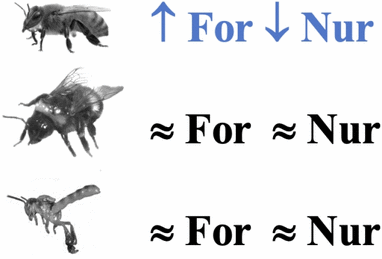 Box 1 Genes and molecular pathways commonly described in the literature as being involved in honeybee worker task division compared to present findings in B. terrestris and T. angustula. For—foragers; Nur—Nurses. Symbols indicate whether evidence suggests that the expression is higher (↑) or lower (↓) in one group compared to the other. Blue indicates higher expression levels in foragers than in nurses and orange indicates the opposite; (≈) in black, no changes identified or controversial evidence; and (↑↓) in red, indicates a mixed pattern, with some genes in the pathway being upregulated or downregulated in one of the two subcastes. A. mellifera by A. Wide, T. angustula by L. Costa—images reproduced with permission from the original authors.