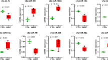 To rank the most differentially expressed miRNAs (DE-miRNAs) between healthy and MCT samples, the results of differential expression analysis performed with DESeq2 were further filtered a more stringent cut-off criteria of an adjusted P value of 0.01 and an absolute log2FC of 2.4. This filtering allowed the identification of sixty-three miRNAs whose abundance differed significantly between MCT and healthy samples, demonstrating that 45 miRNAs were downregulated with a log2FC of between − 2.4 and − 13.4 and 18 miRNAs were upregulated with a log2FC of between 2.4 and 6.9 (Fig. 1b).