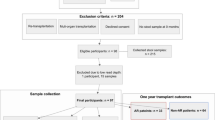 To determine the effect of the similarity of microbiota on transplant outcomes, data about the recipients’ renal function, post-transplant acute rejection, and infection events were collected. The recipients’ renal function was measured by eGFR at 6 months after transplantation using the Chronic Kidney Disease Epidemiology Collaboration calculation formula43. Episodes of acute rejection included cell-mediated and antibody-mediated rejections identified based on the pathology report of the renal biopsy within 6 months after transplantation. In our centre, we performed protocol graft biopsies at 2 weeks after transplantation irrespective of whether there was evidence of an allograft injury and performed indication graft biopsies at any time if clinically suspected for rejection. In the present study, we only included episodes of acute rejection diagnosed by indication graft biopsies. Infection events were defined when viral or bacterial pathogens were identified by culture or when viral DNA was detected by polymerase chain reaction in any specimen (e.g., urine, blood, and bronchial aspiration) within 6 months after transplantation.