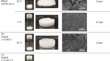 The possible phase structure of the EROCOC17+4/water system below 0 °C was inferred from the SAXS profiles of the 62.5% (w/w) EROCOC17+4 at − 20 °C and the 63% (w/w) EROCOC17+4 at − 60 °C. They both gave two peaks in a 2:1 ratio, 44.5 and 22.5 Å at − 20 °C and 46.8 and 23.4 Å at − 60 °C, respectively, suggesting the formation of an Lα phase with lattice constants of \({\xi }_{{L}_{\alpha }}\left(-20^\circ C\right)\) = 44.5 Å and \({\xi }_{{L}_{\alpha }}\left(-60^\circ C\right)\) = 46.8 Å, respectively. At − 180 °C, the four weak diffractions at 16.2, 12.2, 9.7, and 8.1 Å, observed in the SAXS region of Fig. 4B-(1), could also be compared with the 3rd, 4th, 5th and 6th diffractions of the Lα phase with the lattice constant of \({\xi }_{La}\left(-180^\circ C\right)\) = 48.0 Å. These results indicate that the EROCOC17+4/water and the EROCOC17+4-matrix/water systems most presumably adopted the Lα phase below 0 °C. For comparison, MO adopts the LC phase at 1 °C (Fig. 4A-(3)), and eleven MO-matrixes subjected to the same cryo-cooling procedure displayed strong LC diffractions at − 180 °C without exception, as shown in Sup. Figure 2.